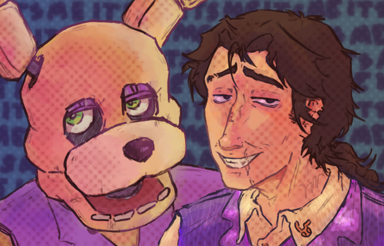 Art of a rather heavily fanonized William Afton and Spring Bonnie! I only made this in a couple of hours, and it's not the best for sure--but I tried to experiment more with halftones. Love how I constructed the face in this, though!!! ART MADE - 10:07:2025