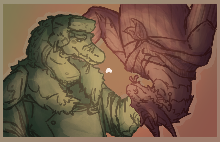 More OC content, only this time IT'S EXCUSED! This is my DND character, a lizardfolk (green) named Taxroül! The red dragonborn is his lovely wife, who I'm making art of as leverage against my DM so he doesn't... kill them... while my character's away... gulp!!! ART MADE - 09:28:2025